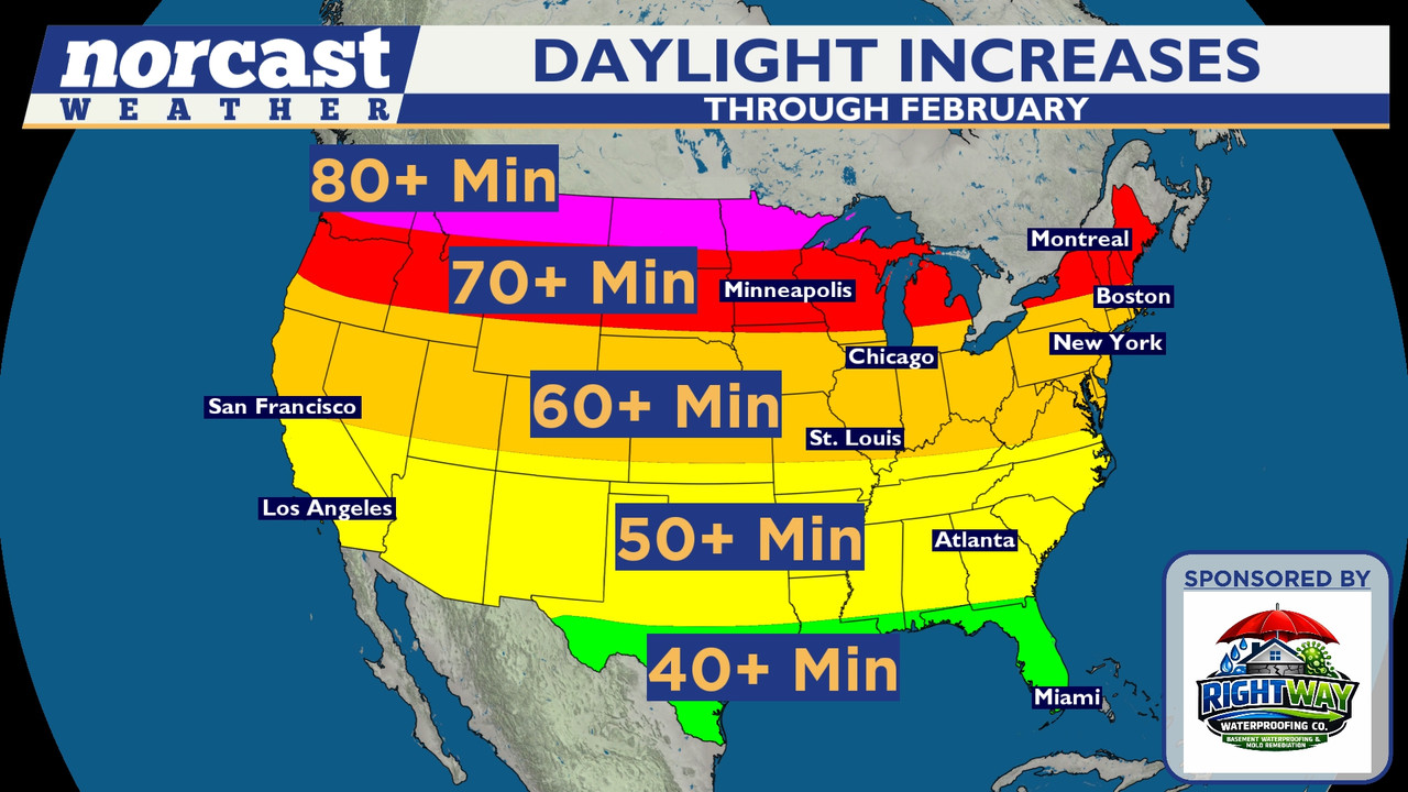 From my local weather guy, the daylight increases for February. Here in NJ, we should gain about 65 minutes 02/02/26 09:55 AM