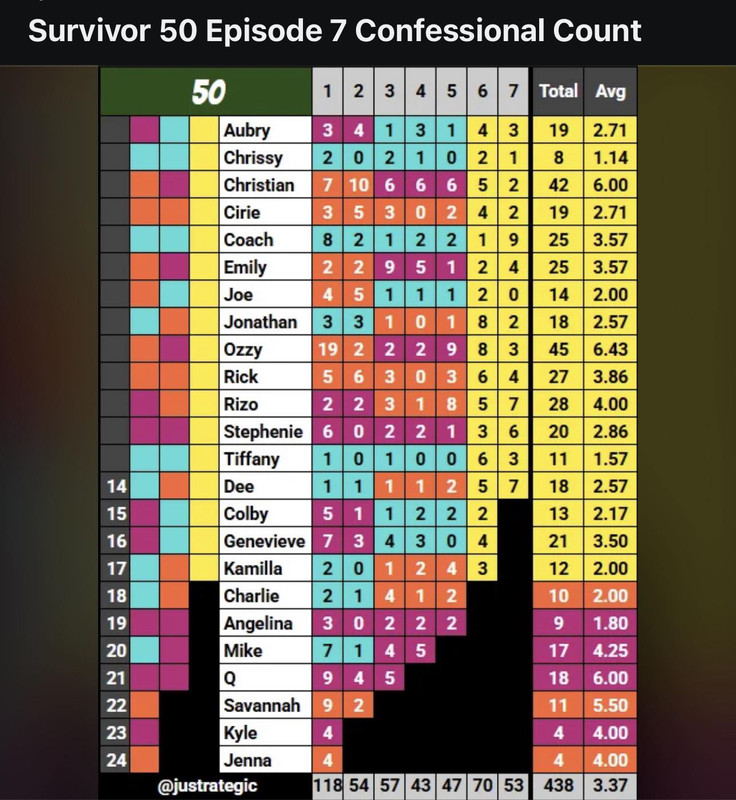* Ozzy and Christian are leading in confessionals, followed by Rizo, Devens, Coach and Emily. Chrissy has the least, followed by Tiffany and Joe
